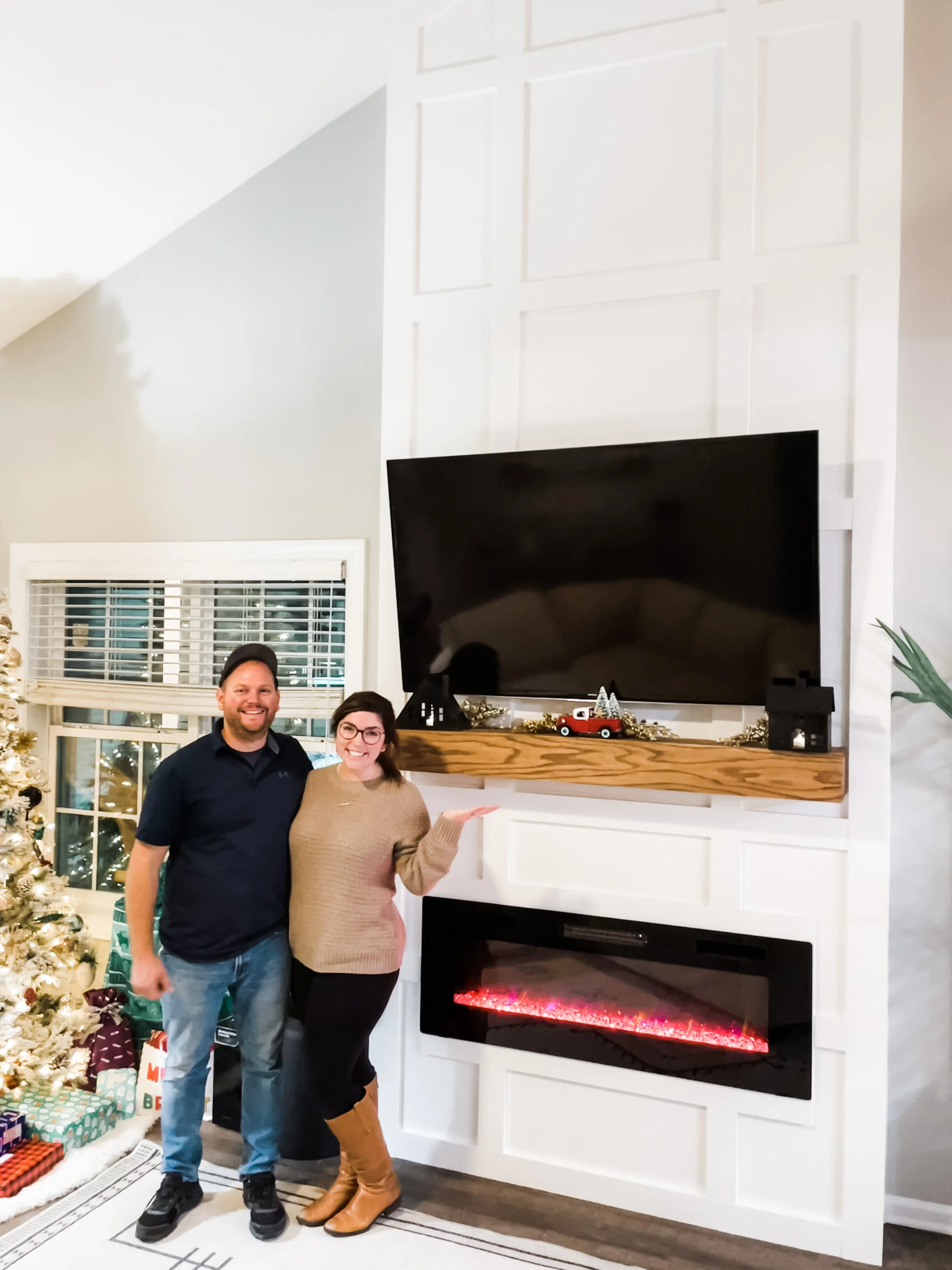 Board and Batten Fireplace with Electric Fireplace and Custom Oak Mantle