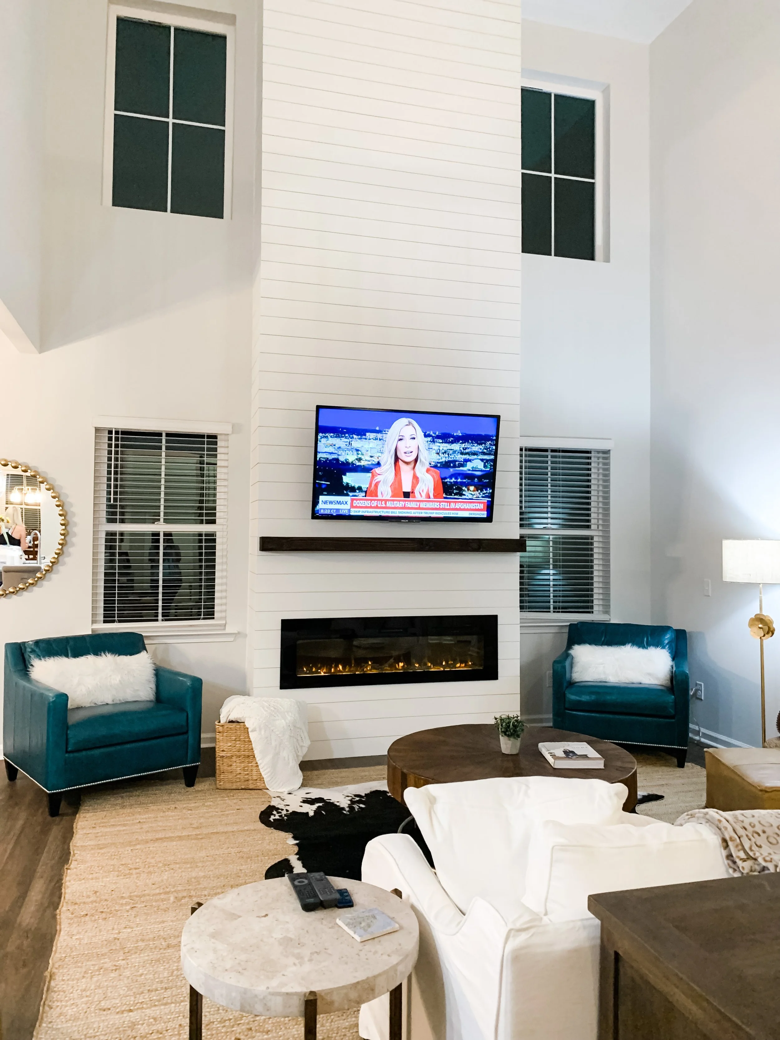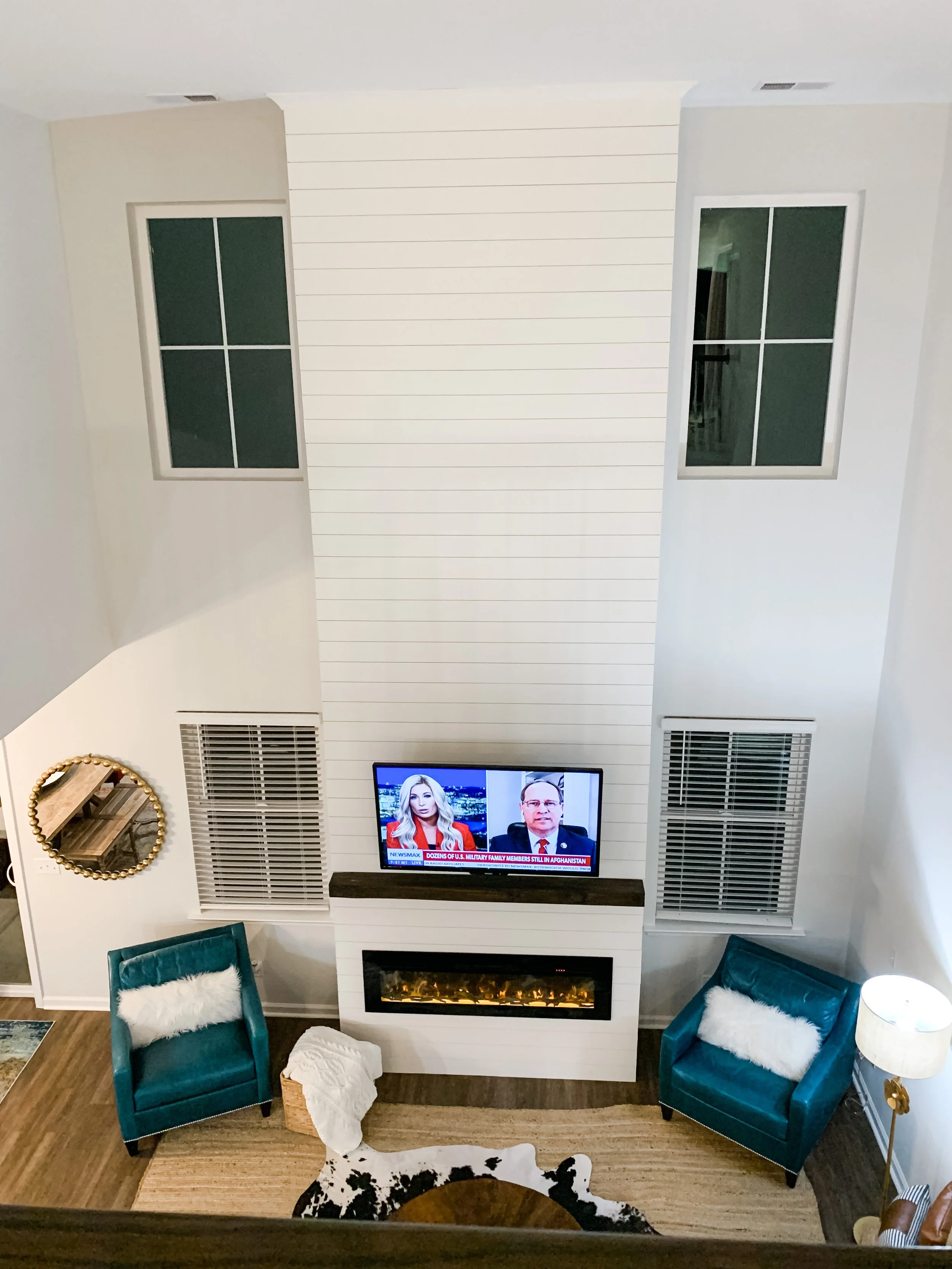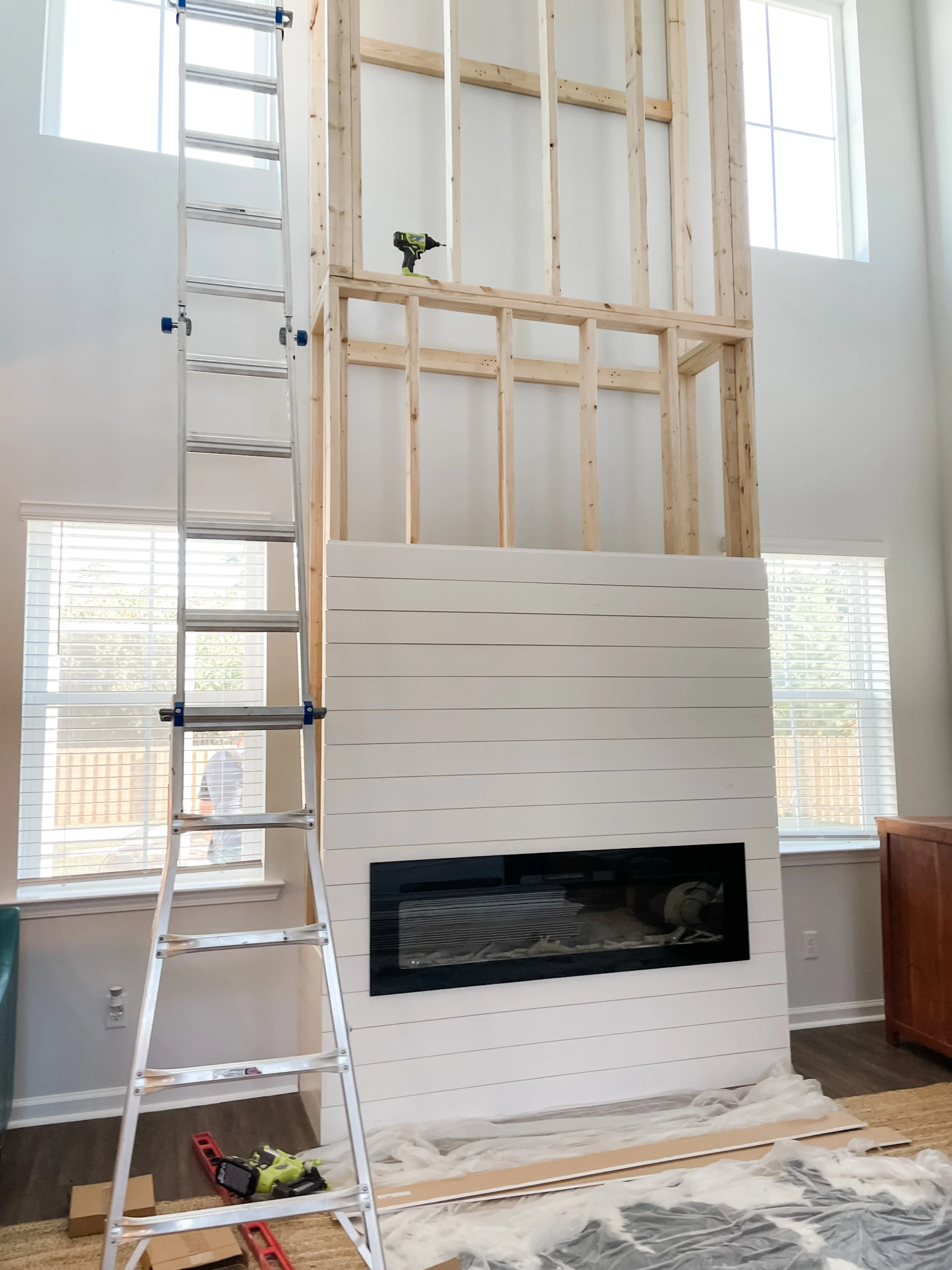 Shiplap Fireplace Buildout w/ Mantle, Electric Fireplace, and Storage Hearth